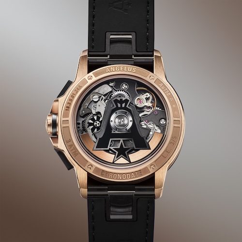 Auch die Chronographenknöpfe bestehen aus Karbonverbundstoff. Die feststehende Lünette ist mit zwölf Einbuchtungen markiert. Der 30-Minuten-Zähler und die Kleine Sekunde heben sich mit ihrem metallischen Schwarz und ihrer azurierten Textur vom mokkafarbenen Zifferblatt ab. Im Inneren dieser Chronodate Moka bringt Angelus sein manufaktureigenes, automatisches Chronographenwerk zum Einsatz, das Kaliber A-500.
