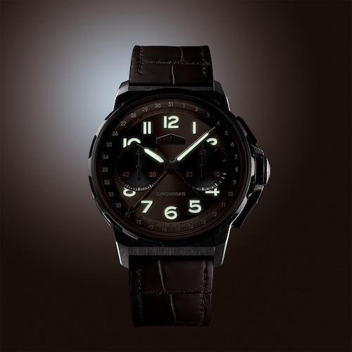 Die Chronodate Moka Editionen präsentieren sich in einem 42,5 Millimeter großen Gehäuse aus Carbonverbundstoff kombiniert mit Rotgold (5N) oder Titan (Grade 5). Es ist wasserdicht bis drei Bar, das entspricht dem Prüfdruck von 30 Metern Tiefe.