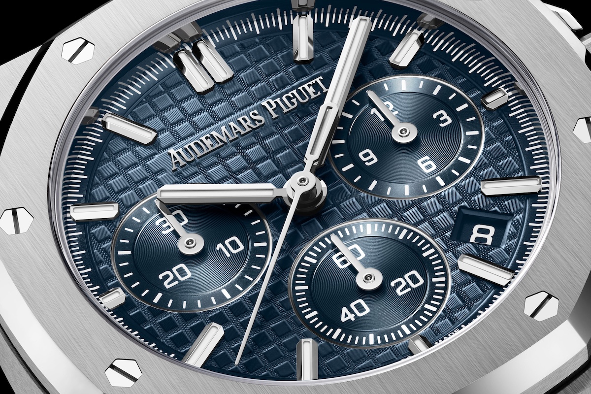 In der Ausführung aus Edelstahl (Referenz 26450ST) bleibt das Design der Linie erhalten. Das Zifferblatt im Farbton »Bleu Nuit, Nuage 50« mit »Grande Tapisserie«-Motiv prägt die Optik, während das Datumsfenster nun zwischen vier und fünf Uhr positioniert wurde. Zudem befindet sich der Minutenzähler auf der Position bei neun Uhr und der Stundenzähler auf drei Uhr.