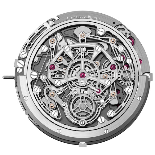 Um bei einem Durchmesser von 39 Millimetern das flache Profil von 8,1 Millimetern zu erzielen, kombinierte Audemars Piguet das Mittelteil aus Titan mit metallischem Massivglas (BMG). Auf der Vorderseite wie dem Gehäuseboden kommt plan eingefügtes Saphirglas zum Einsatz.