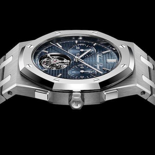 Erstmals in der Geschichte der Royal Oak vereint das Kaliber 8100 eeinen automatischen Chronographen mit eine Fliegenden Tourbillon.