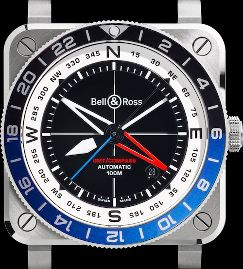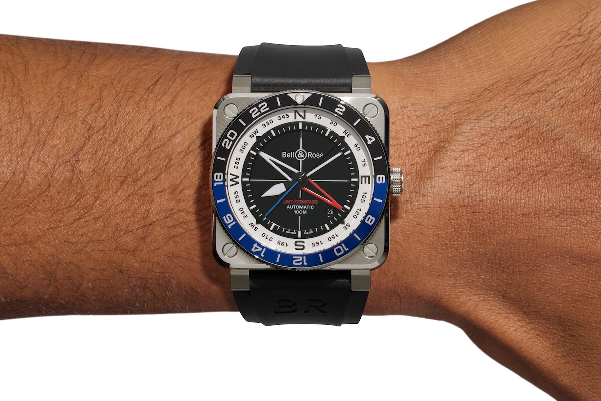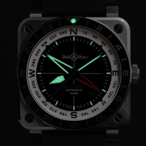 Mit einer zweifarbigen Lünette und einem im Kompassform gestalteten Zifferblatt verleiht Bell & Ross der Bell & Ross BR-03 GMT Compass den markentypischen Look einer Instrumentenuhr.