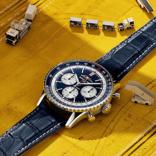 Dieser Blick in das tiefe Blau der Stratosphäre ist das gestalterische Leitmotiv der neuen Navitimer: Das Zifferblatt zeigt genau diesen Farbton, die weißen Hilfszifferblätter des Chronographen referenzieren den Beinamen des Überschallfliegers. Das 43 Millimeter große Gehäuse aus Edelstahl trägt eine beidseitig drehbare Lünette aus Platin mit dem charakteristischen runden Rechenschieber der Navitimer.
