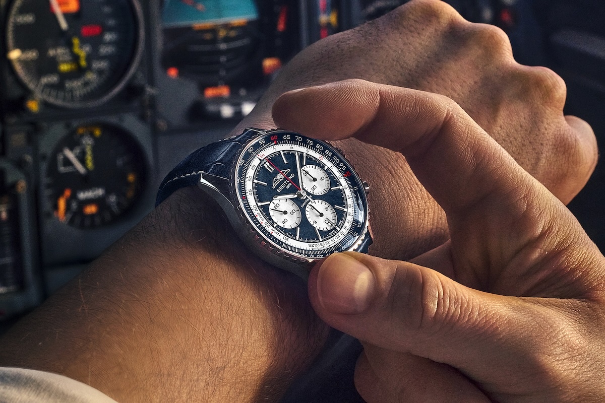 Im Inneren arbeitet das automatisch aufgezogene Breitling-Manufakturkaliber 01 mit bidirektionalem Kugellagerrotor, Schaltradsteuerung und Vertikalkupplung. Das Werk leistet eine Gangautonomie von rund 70 Stunden und schwingt mit vier Hertz – 28.800 Halbschwingungen pro Stunde.