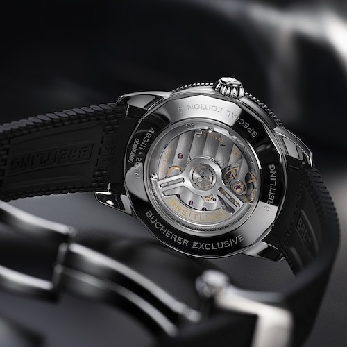Die zweiachsige Schwungmasse mit Kugellager zieht beidseitig auf. Breitling bezeichnet das B31 als eigenes Manufakturkaliber, das intern konstruiert und entwickelt wurde. Gefertigt wird es exklusiv von der Manufacture AMT, einem Tochterunternehmen von Sellita in La Chaux-de-Fonds. Das sogenannte Mesh-Rubber-Armband mit Edelstahlfaltschließe ist aus Kautschuk gefertigt und nahtlos integriert.