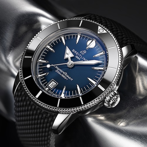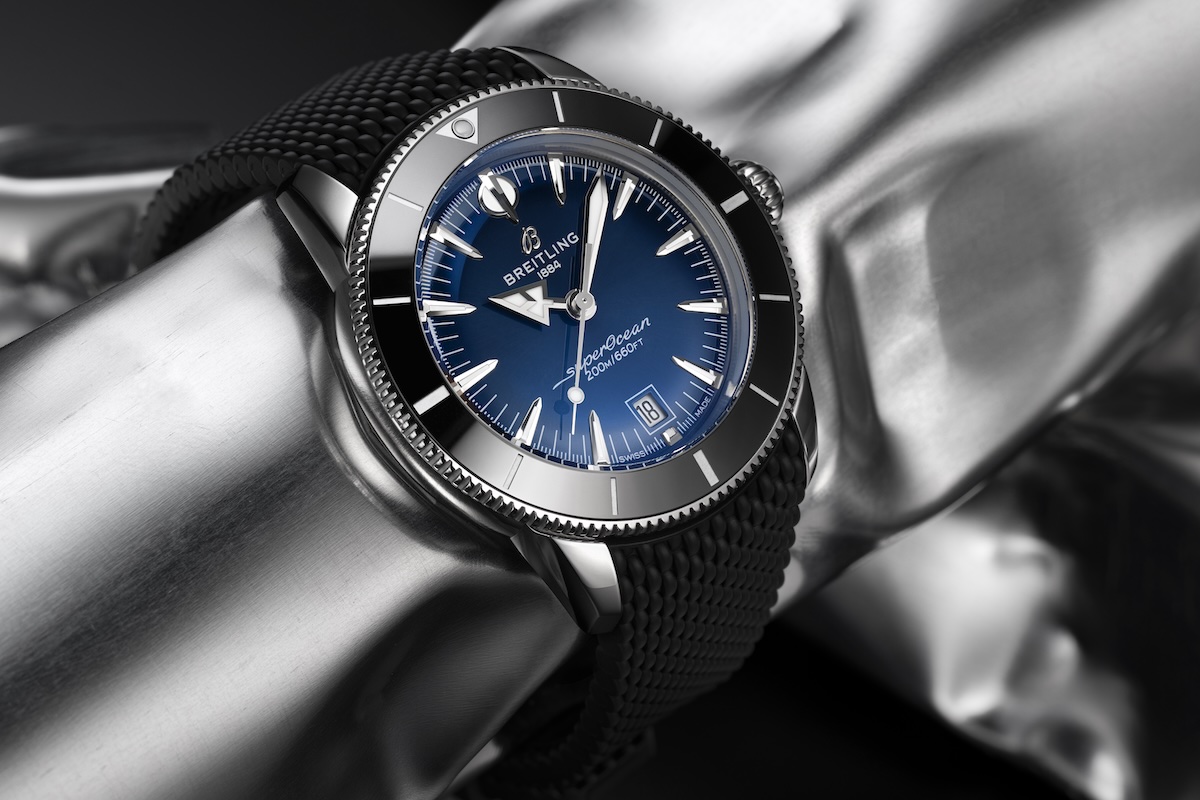 Die Breitling x Bucherer Superocean Heritage hat ein tiefblaues Zifferblatt und eine schwarze Keramiklünette.