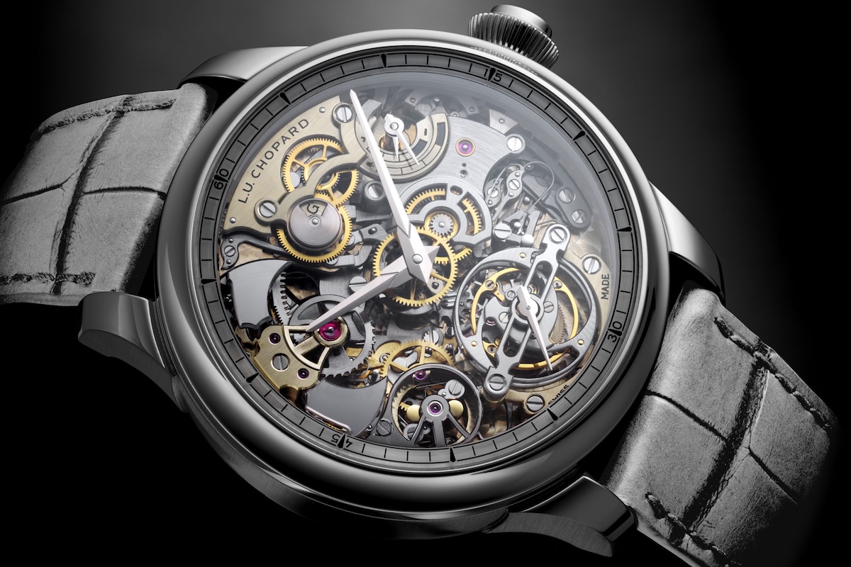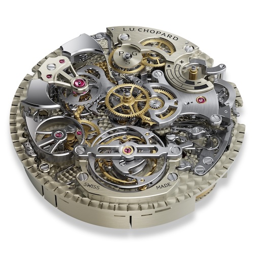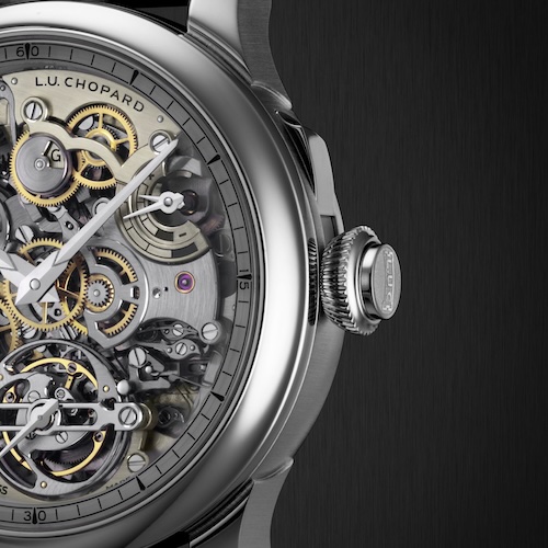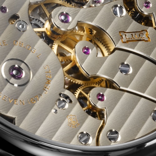 Auf der unteren Hälfte des Zifferblatts befindet sich das Minutentourbillon. Das Ziehen der Krone führt zu einem Stopp des Tourbillons, das sich so sekundengenau einstellen lässt. Das Handaufzugkaliber L.U.C 08.03-L besteht aus 686 Komponenten, besitzt 67 Steine und bietet eine Gangautonomie von 70 Stunden.