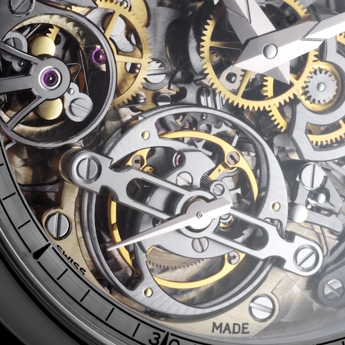 Durch den Verzicht auf ein Zifferblatt steht die Mechanik im Mittelpunkt. Bei zehn Uhr sind zwei polierte Stahlhämmer zu sehen, die auf die Funktion des Schlagwerks verweisen.