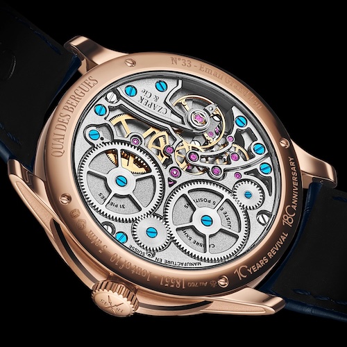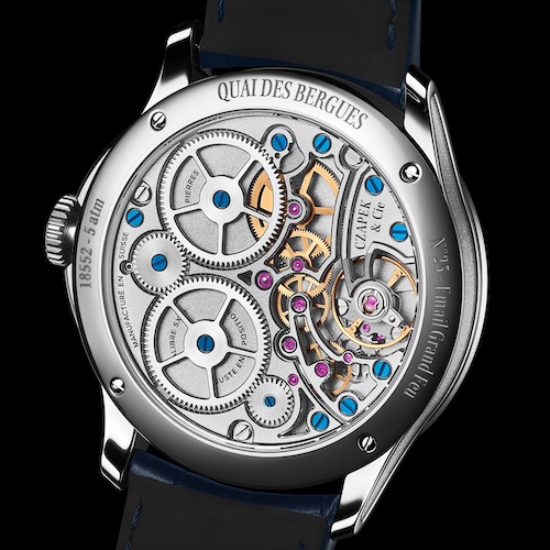 Die »Sursum Corda« wird vom hauseigenen Handaufzugskaliber SXH1 angetrieben, das sich schon in den ersten Quai-des-Bergues-Armbanduhren befand. Das Uhrwerk orientiert sich in seiner Architektur an Taschenuhren aus der Mitte des 19. Jahrhunderts mit zwei Federhäusern, einem symmetrischer Aufbau und offenen Sperrrädern.