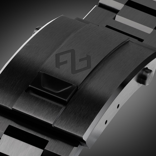 Die Brücken besitzen eine lasertexturierte Grainé-Oberfläche mit vertikal satinierten Kanten, veredelt durch eine galvanische Black-Gold-Beschichtung. Die Schrauben sind thermisch gebläut.