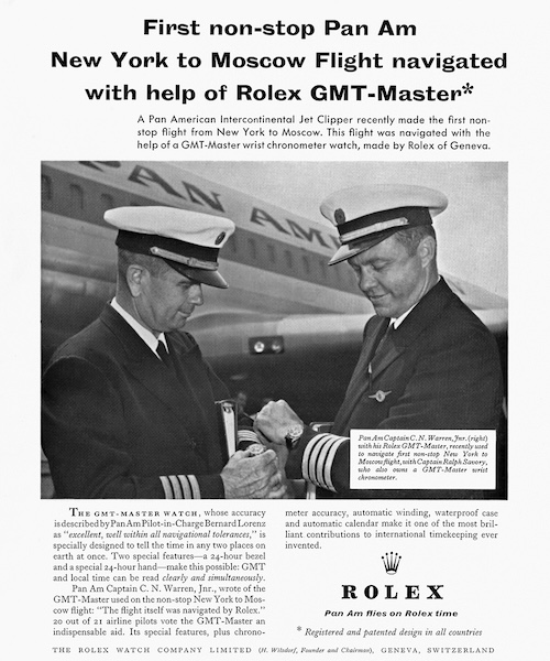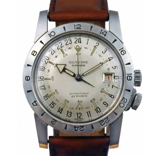 1953 brachte Glycine mit der Airman eine der ersten Armbanduhren auf den Markt, die speziell für Piloten eine 24‑Stunden-Anzeige mit zusätzlicher Zeitzonenfunktion verband und damit das Konzept der Mehrzonen‑Uhr vorwegnahm. 1954 folgte Rolex mit der GMT‑Master, entwickelt im Auftrag von Pan American World Airways: Ein zusätzlicher 24‑Stunden‑Zeiger und eine drehbare, zweifarbige 24‑h‑Lünette ermöglichten es, Heimat- und Lokalzeit auf einen Blick abzulesen, wodurch dieses Layout zum Archetyp der modernen GMT‑Sportuhr wurde.