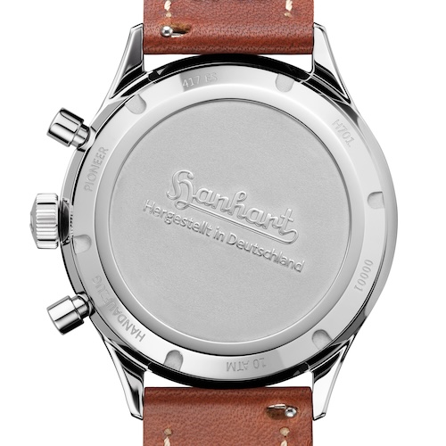 Der geschraubte Gehäuseboden aus Edelstahl ist mit dem historischen Hanhart-Schriftzug geprägt.