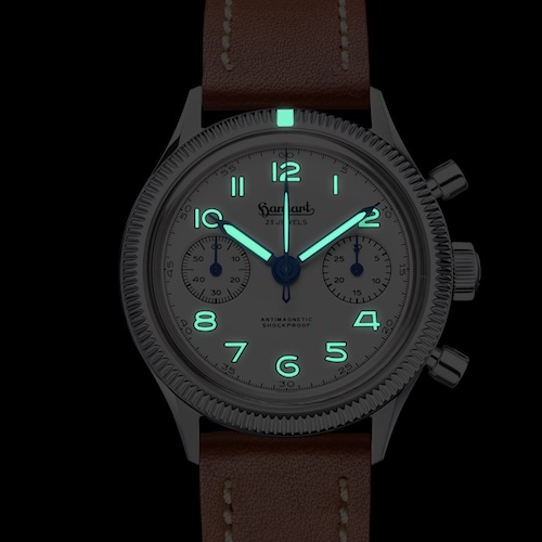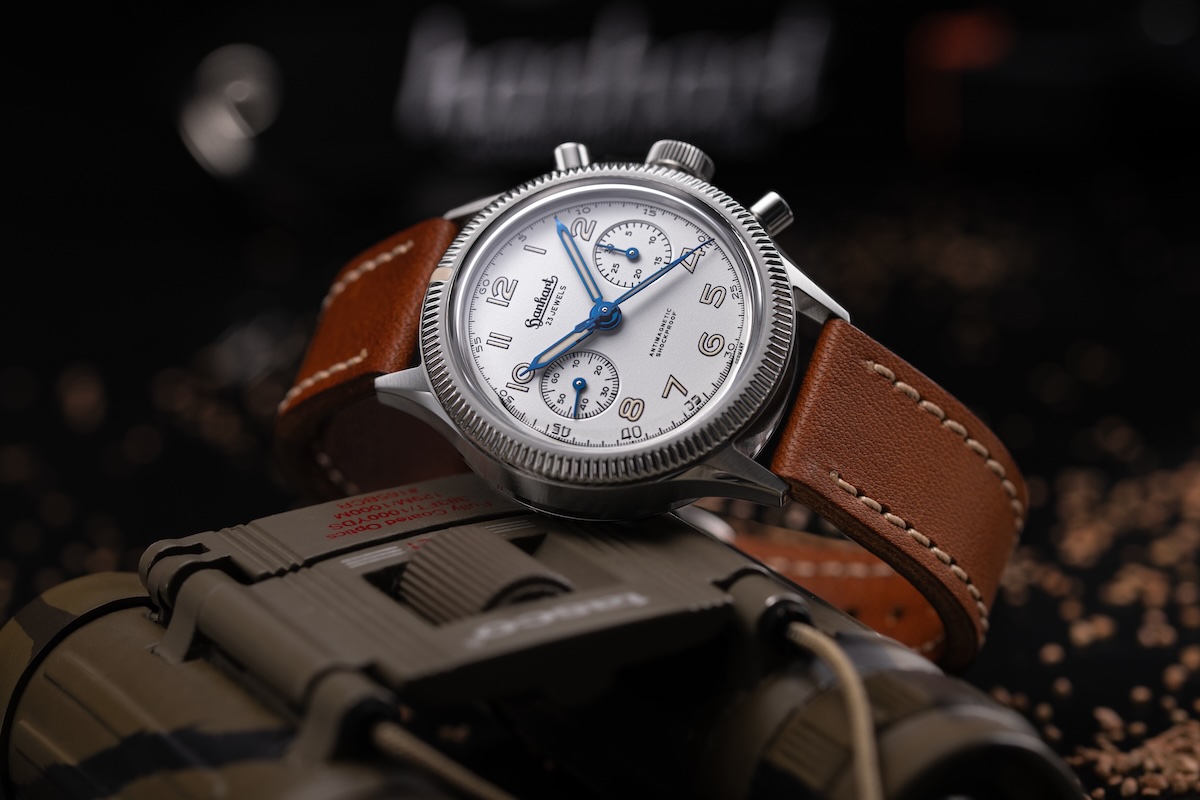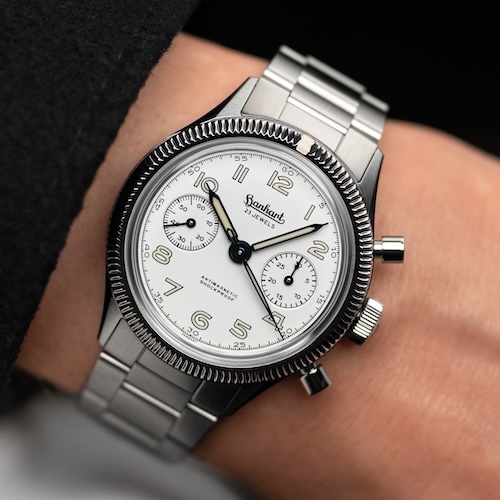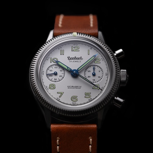 Der Hanhart 417 ES Chronograph ist ein bezahlbares Exemplar für Sammler, die einen sorgfältig gestalteten und historisch stimmigen Flieger-Chronographen schätzen. Das gilt umso mehr für die neue »Moby-Dick«-Variante mit weißem Zifferblatt. Das robuste Handaufzugwerk passt in seiner optischen Nüchternheit zu dem sachlichen Auftritt des  Zeitmessers. Hanhart verbindet geschickt die Designelemente der 1950er Jahre mit zeitgemäßen Materialien und moderner Fertigungstechnik.