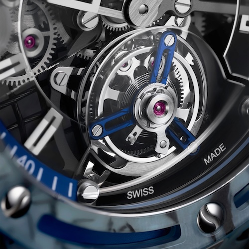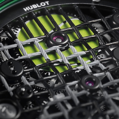 Das Sperrrad des Federhauses ist wie ein Tennisball gestaltet und durch die Unterseite der gitterförmigen Werkplatte hindurch sichtbar. Eine transparente Saphirglasschicht dient als Zifferblatt und trägt die applizierten Stundenindizes. Die sechs Titanschrauben, mit denen die Lünette aus Verbundmaterial befestigt ist, sind wie Tennisbälle geformt.