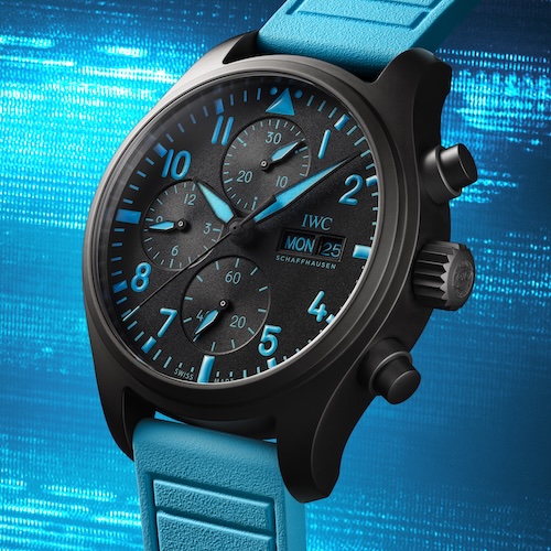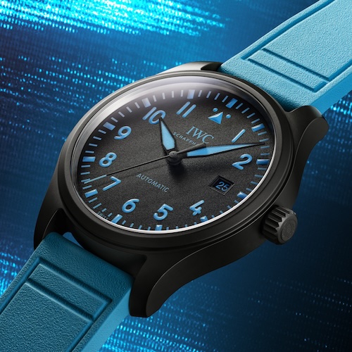 Auch seine verschraubte Krone ist aus Ceratanium gefertigt. Sein IWC Kaliber 32112 arbeitet ebenfalls mit vier Hertz, besitzt 21 Steine; bietet aber eine Gangautonomie von 120 Stunden. Ankerrad und Anker sind aus amagnetischem Silizium gefertigt. Das blaue Kautschukarmband wird mit einer Dornschließe aus Ceratanium am Arm gesichert.