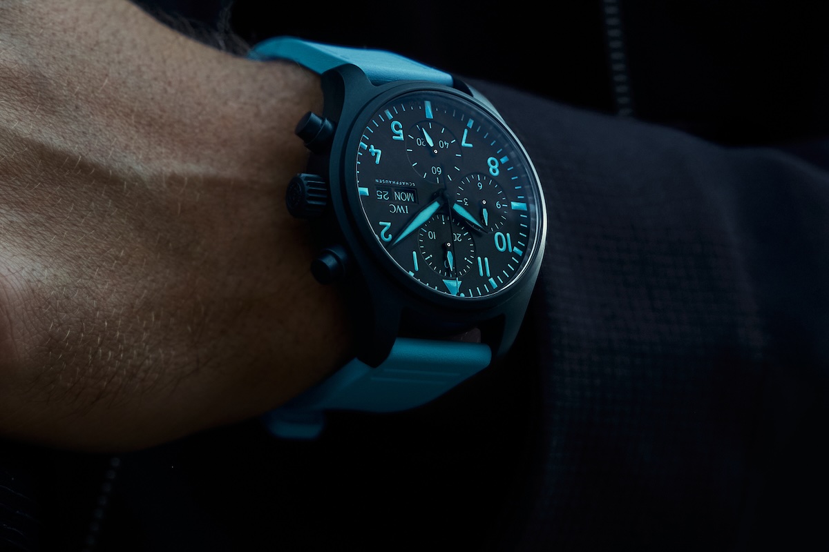Die Krone und die Drücker des Chronographen sind aus Ceratanium gefertigt. Das von IWC Schaffhausen entwickelte Material soll die Leichtigkeit von Titan mit der Kratzfestigkeit von Keramik verbinden. Das schwarze Zifferblatt ist mit Indizes und Ziffern in George Russells charakteristischem Blauton bedruckt. Die schwarzen Zeiger sind mit Super-Luminova in der gleichen Farbe ausgefüllt.
