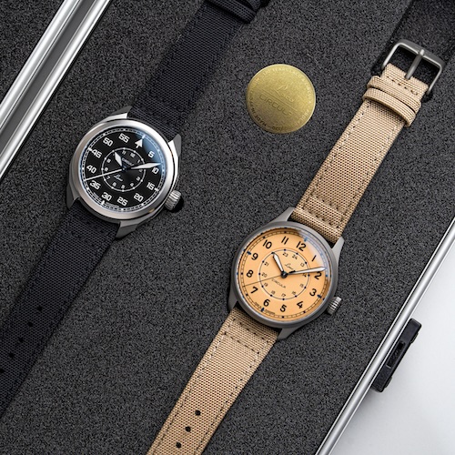 Die sandfarbenen oder schwarzen Segeltuchbänder sind mit einem Echtlederfutter, Schnellwechselfederstegen und einer Dornschließe versehen. Die Uhrensets sind über bei Hersteller zu beziehen und werden ab Ende Januar 2026 in einem Alu-Etui mit einer Mümze mit Limitierungsnummer ausgeliefert.