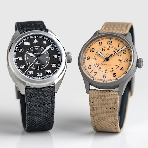 Beide Modelle besitzen ein Gehäuse aus Edelstahl mit einem Durchmesser von jeweils 40 Millimetern. Das Modell auf Laco Pro-Basis ist wasserdicht bis 20 Bar, das entspricht dem Prüfdruck in 200 Metern Tiefe. Das Modell von Circula widersteht dem Druck bis 15 Bar. Sein schwarzes Zifferblatt mit dem innenliegenden Stundenkreis erinnert an das Baumuster B deutscher Fliegeruhren.