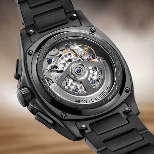 Das automatische Uhrwerk Mido Kaliber 60 basiert auf dem ETA A05.231 und arbeitet mit einer Frequenz von vier Hertz, das entspricht 28.800 Halbschwingungen in der Stunde.