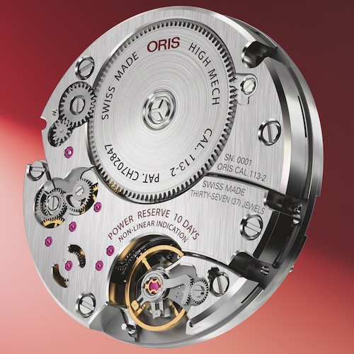 Das Handaufzugwerk Oris Calibre 113 arbeitet mit einer Frequenz von drei Hertz.