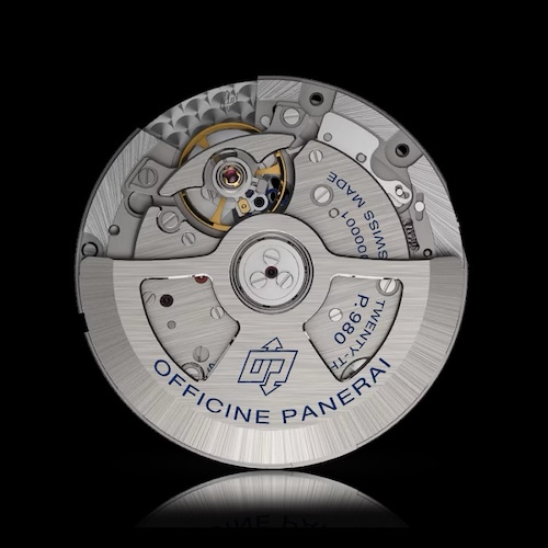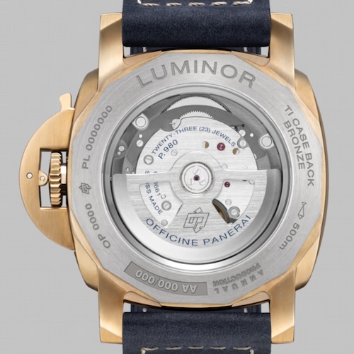 Ziffern und Zeiger sind mit beigefarbener Super-Luminova belegt. Durch den Saphirglasboden offenbart sich das neue Kaliber P.980.