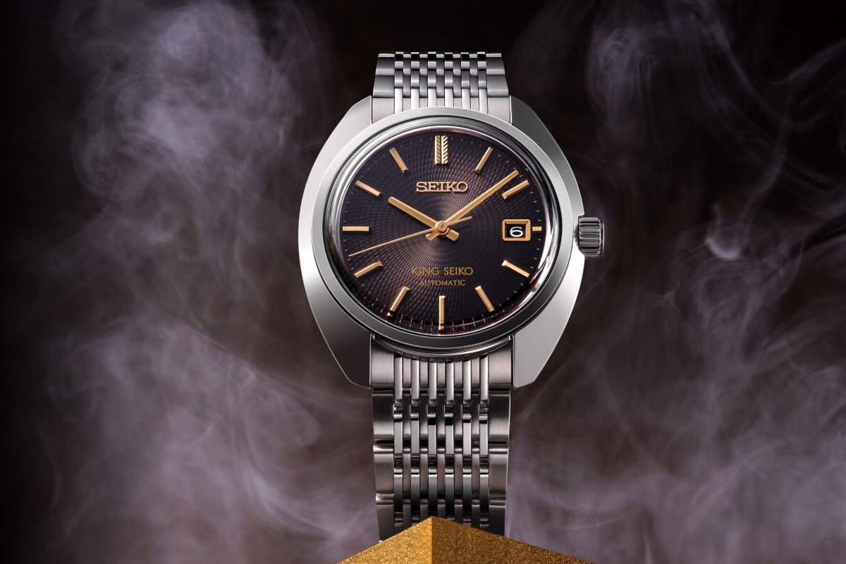 Das Zifferblatt des King Seiko-Modells SJE121 kombiniert ein fein geprägtes Muster mit einem tiefen Grau-Verlauf.