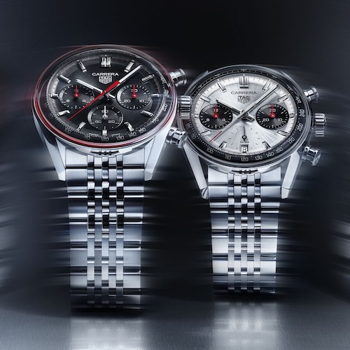 Auch die blaugrüne Version bietet rhodinierte Zeitanzeigen, die mit weißer Super-Luminova markiert sind. Die Carrera mit schwarzem Zifferblatt hingegen verfügt über kontrastierende Elemente wie den roten Chronographenzeiger und einen gleichfarbigen Außenring.