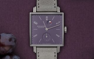 Die Glashütter Manufaktur Nomos stellt eine neue Version ihres Modells Tetra mit pflaumenfarbenem Zifferblatt vor. Die 29,5 mal 29,5 Millimeter große Uhr schmücken silberne Indizes, Ziffern und Zeiger sowie eine Gangreserveanzeige zwischen zwölf und ein [...]