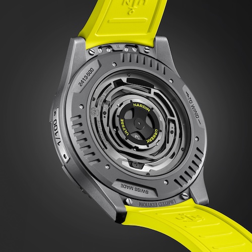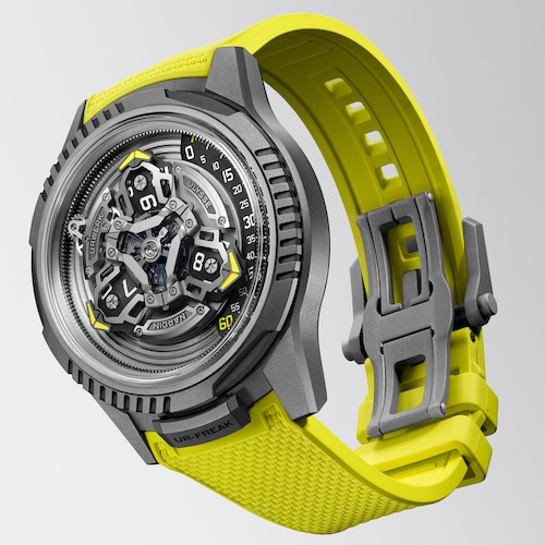 Dazu gehören drei deutlich abgegrenzte geriffelte Abschnitte auf der drehbaren Lünette und dem Gehäuseboden aus Titan, ein charakteristisches Designelement von Urwerk. Die Ur-Freak ist wasserdicht bis drei Bar, das entspricht dem Prüfdruck von 30 Metern Tiefe. Das neu entwickelte automatische Kaliber UN-241 lässt sich auch ohne Krone durch Drehen des Gehäusebodens aufziehen.