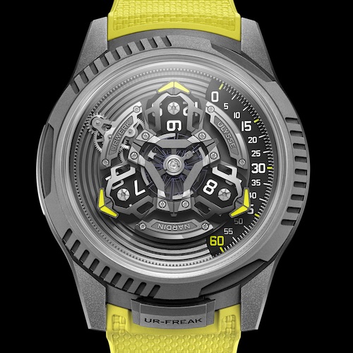 Mit Ulysse Nardin und Urwerk haben sich zwei der innovativsten unabhängigen Schweizer Uhrenmarken zusammengefunden. Das von Ludwig Oechslin entwickelte Uhrwerk der Freak das sich um seine Mittelachse dreht und auf der Vorderseite selbst die Zeit anzeigt, ist für sich schon spektakulär genug. Aber die Verbindung mit den wandernden Stunden der Satellitenanzeige von Urwerk kombiniert zwei avantgardistische Konstruktionen zu einem herausragenden Konzept.