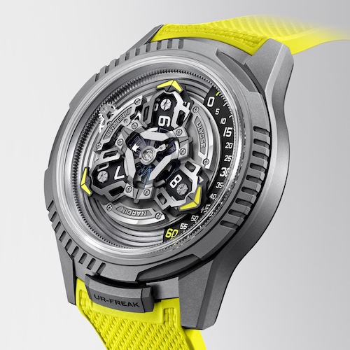 Es arbeitet mit einer Frequenz von drei Hertz, das entspricht 21.600 Halbschwingungen. Das Uhrwerk besteht aus 263 Komponenten, besitzt 25 Rubine und bietet eine Gangautonomie von 90 Stunden. Die Ur-Freak ist mit einem texturierten gelben und einem schwarzen Kautschukband mit einer Faltschließe aus sandgestrahltem Titan ausgestattet.