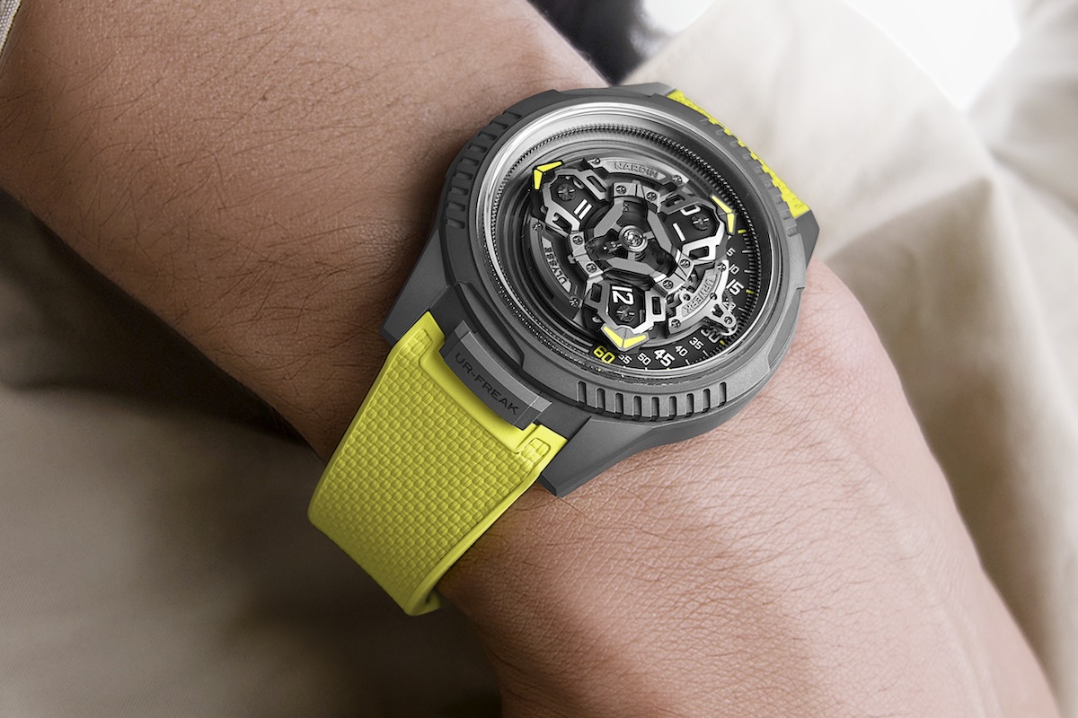 Das gesamte wandernde Stundensystem ist mit der Hemmung der Freak verbunden. In deren Zentrum befindet sich eine Unruh mit Hemmung auf Siliziumbasis. Sie dreht sich mit dem Satellitensystem und vollführt alle drei Stunden eine volle Umdrehung. Ähnlich wie bei einem traditionellen Tourbillon oder Karussell trägt die ständige Änderung der Ausrichtung beim Ur-Freak dazu bei, Zeitmessfehler zu reduzieren. Das sandgestrahlte Titangehäuse mit einem Durchmesser von 44 Millimetern ist im typischen Urwerk-Grau gehalten.