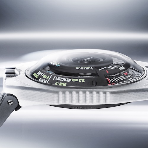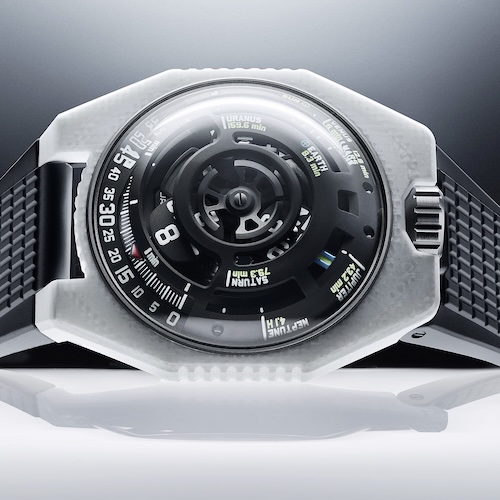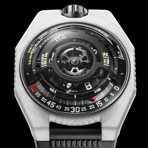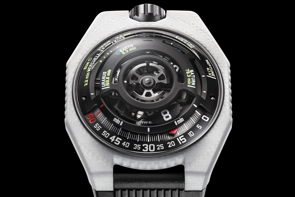 Die Urwerk UR100v Lightspeed zeigt an, wie lange Licht von unserer Sonne bis zu den einzelnen Planeten benötigt.