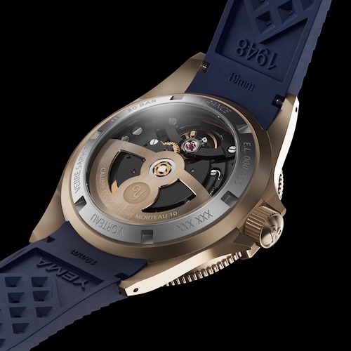 Sie ist wasserdicht bis 30 Bar, das entspricht dem Prüfdruck von 300 Metern Tiefe. Das Bronzegehäuse poliert und satiniert und entwickelt je nach Tragegewohnheit und Nutzung mit der Zeit eine individuelle Patina. Das doppelt gewölbte Saphirglas ist 2,2 Millimeter hoch.