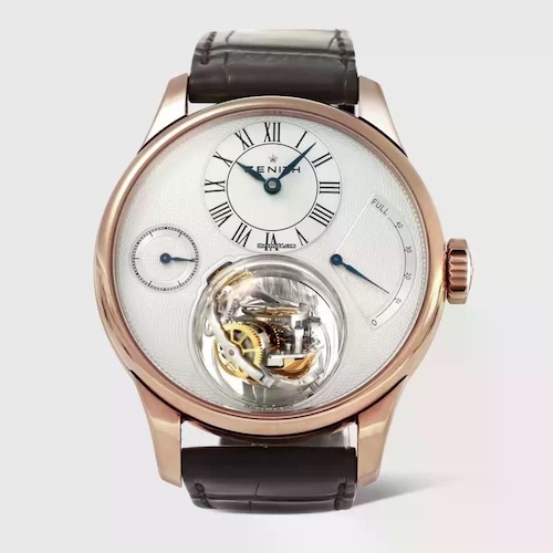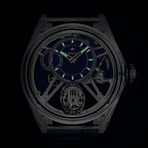 Anlässlich des 160-jährigen Jubiläums der Manufaktur lanciert Zenith zwei limitierte Sondermodell dieser Komplikation, die vollständig aus Saphirglas gefertigt sind. Eine bekannte Lösung, um die negativen Auswirkungen der Schwerkraft auf die Ganggeanuigkeit des Uhrwerks auszugleichen ist das Tourbillon.