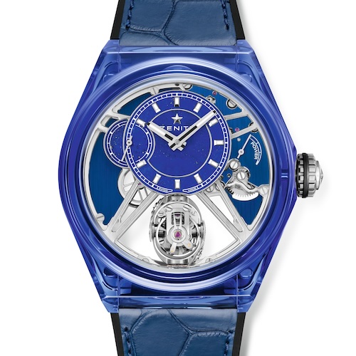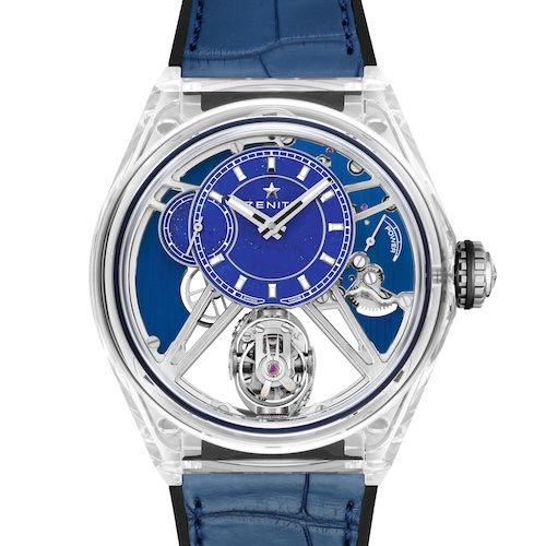 Zenith Defy Zero G, Saphirglas mit Alligatorlederband, transparente Ausführung oder in tiefem Blau, jeweils limitiert auf zehn Exemplare, 220.000 Euro