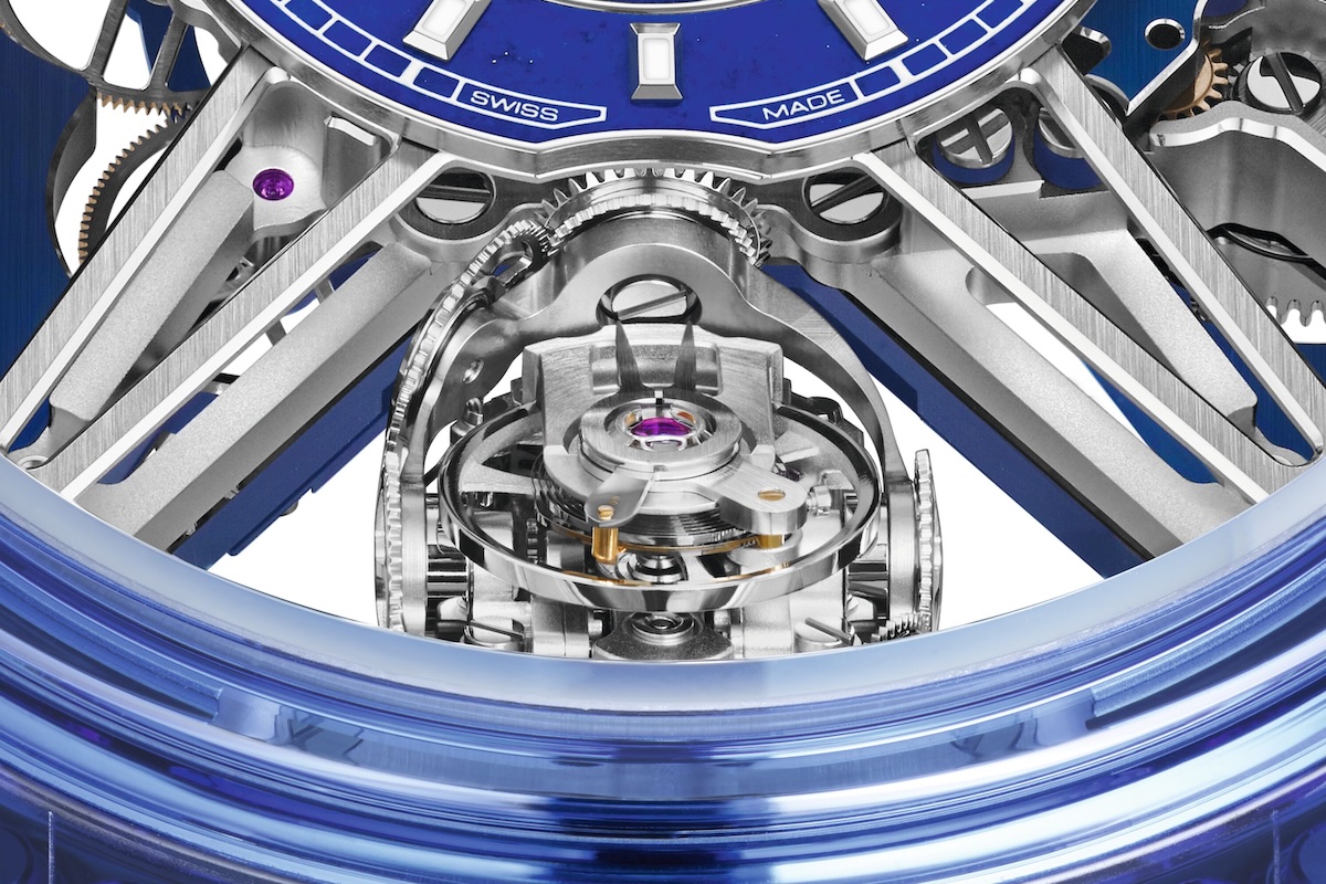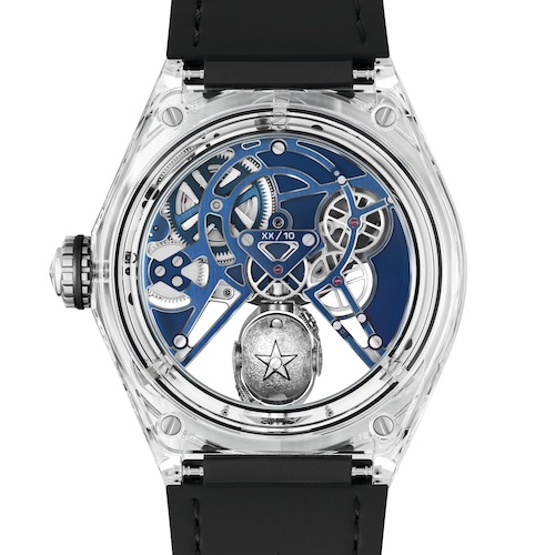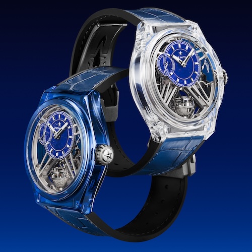 Der Mittelteil, die Lünette und der Boden des 46 Millimeter großen Gehäuses der beiden neuen Modelle sind aus Saphirglasblöcken geschliffen. Es ist wasserdicht bis drei Bar, das entspricht dem Prüfdruck von 30 Metern Tiefe. Das durchbrochene Lapislazuli-Zifferblatt ist mit goldfarbenem Pyrit meliert und verfügt über facettierte Stundenindizes mit Leuchtbeschichtung. Die Gangautonomie von 50 Stunden wird bei drei Uhr angezeigt.